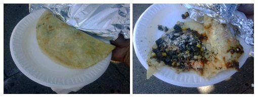 Along Roosevelt Avenue, you’ll find any number of taco stands that sell fresh quesadillas. This particular cart had no name anywhere to be found. It sits on a lonely corner at 99th and Roosevelt on the NE side of the intersection. If, for some forsaken reason, you haven’t had a real Mexican quesadilla, it’s well worth the $2-$3 treat. Almost always made with fresh masa, they consist of large corn tortillas, pressed to about a 10-inch diameter, then cooked on a hot, dry griddle and filled with any number of ingredients.